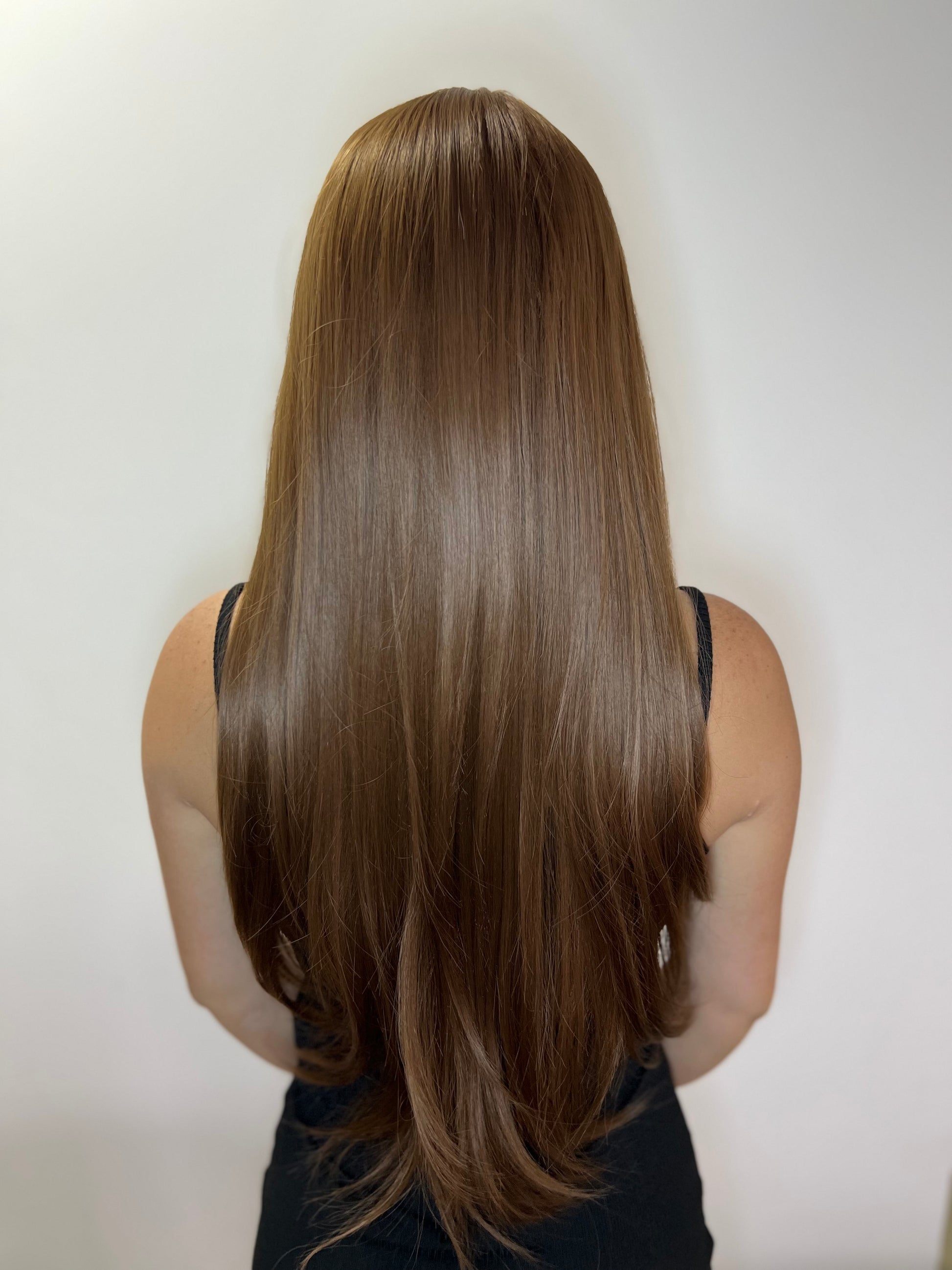 La Aurora Dorada deslumbra con su tono castaño claro que brilla como los primeros rayos de sol acariciando el amanecer. Su caída larga, lacia y sedosa transmite elegancia, suavidad y frescura, convirtiéndose en una extensión natural de tu propia esencia.