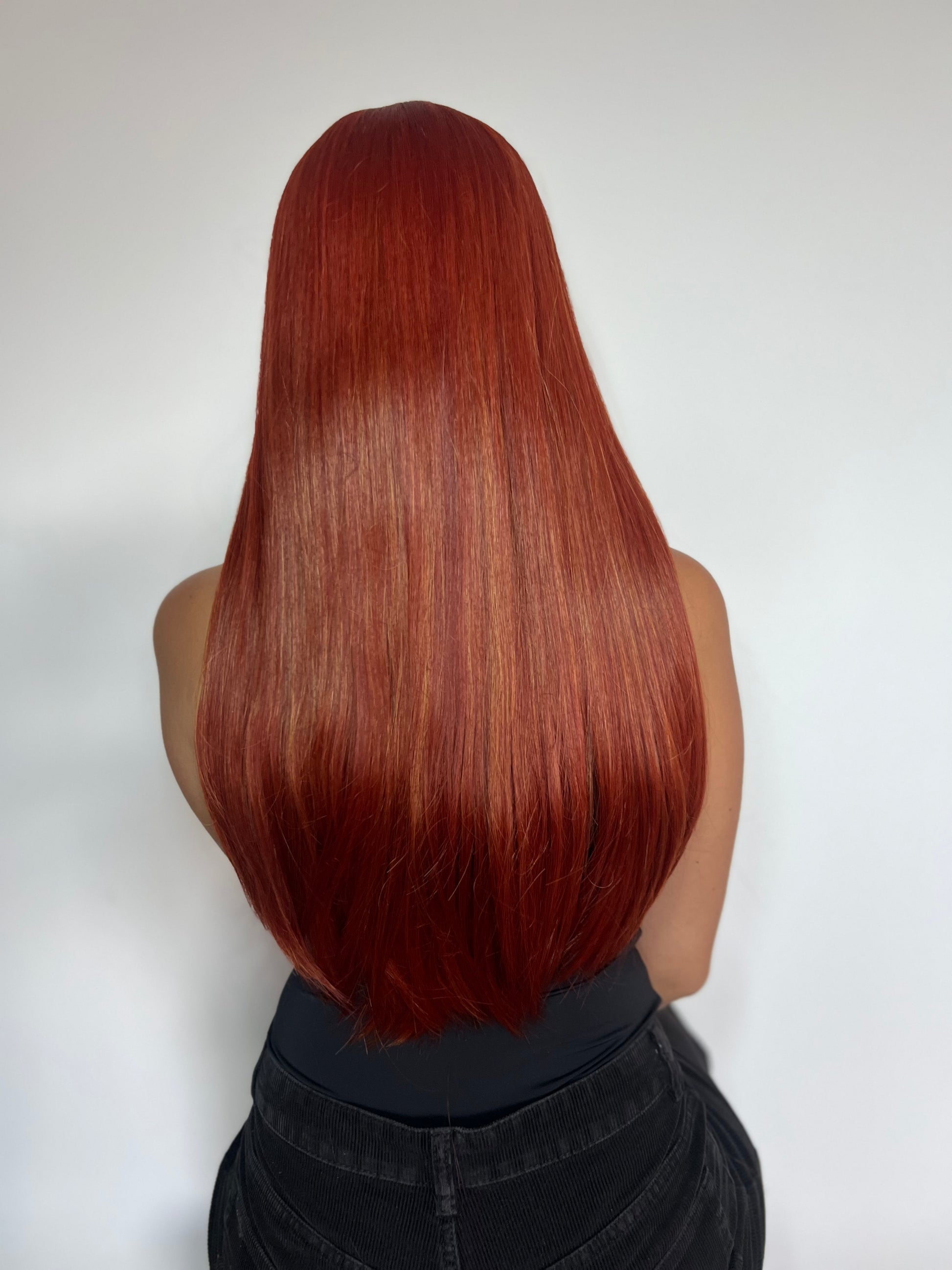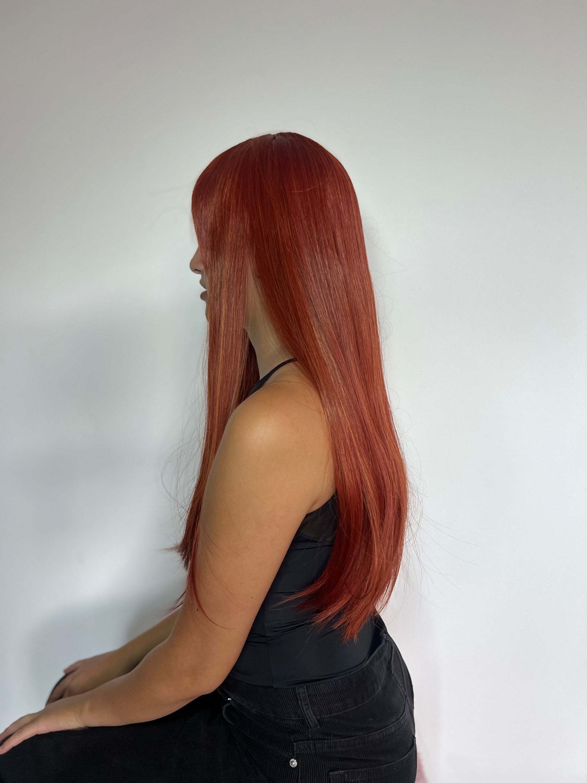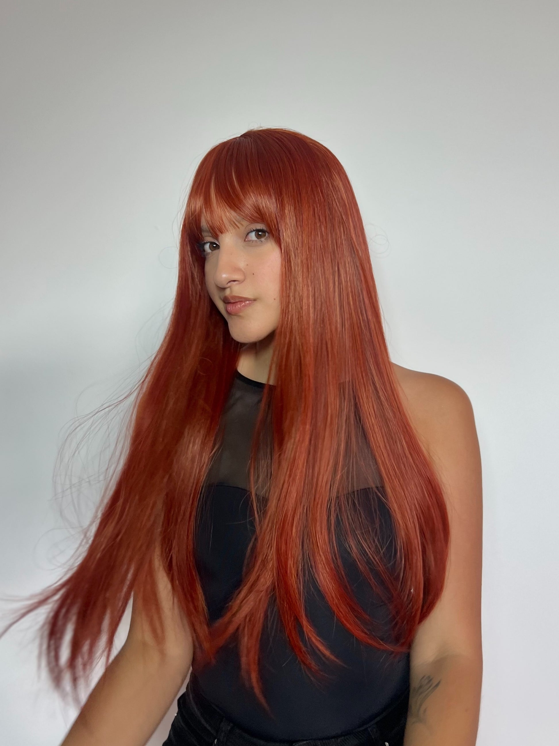 Esta peluca en tono cobre intenso y radiante deslumbra con su brillo natural, evocando la energía del sol naciente que renueva y transforma.