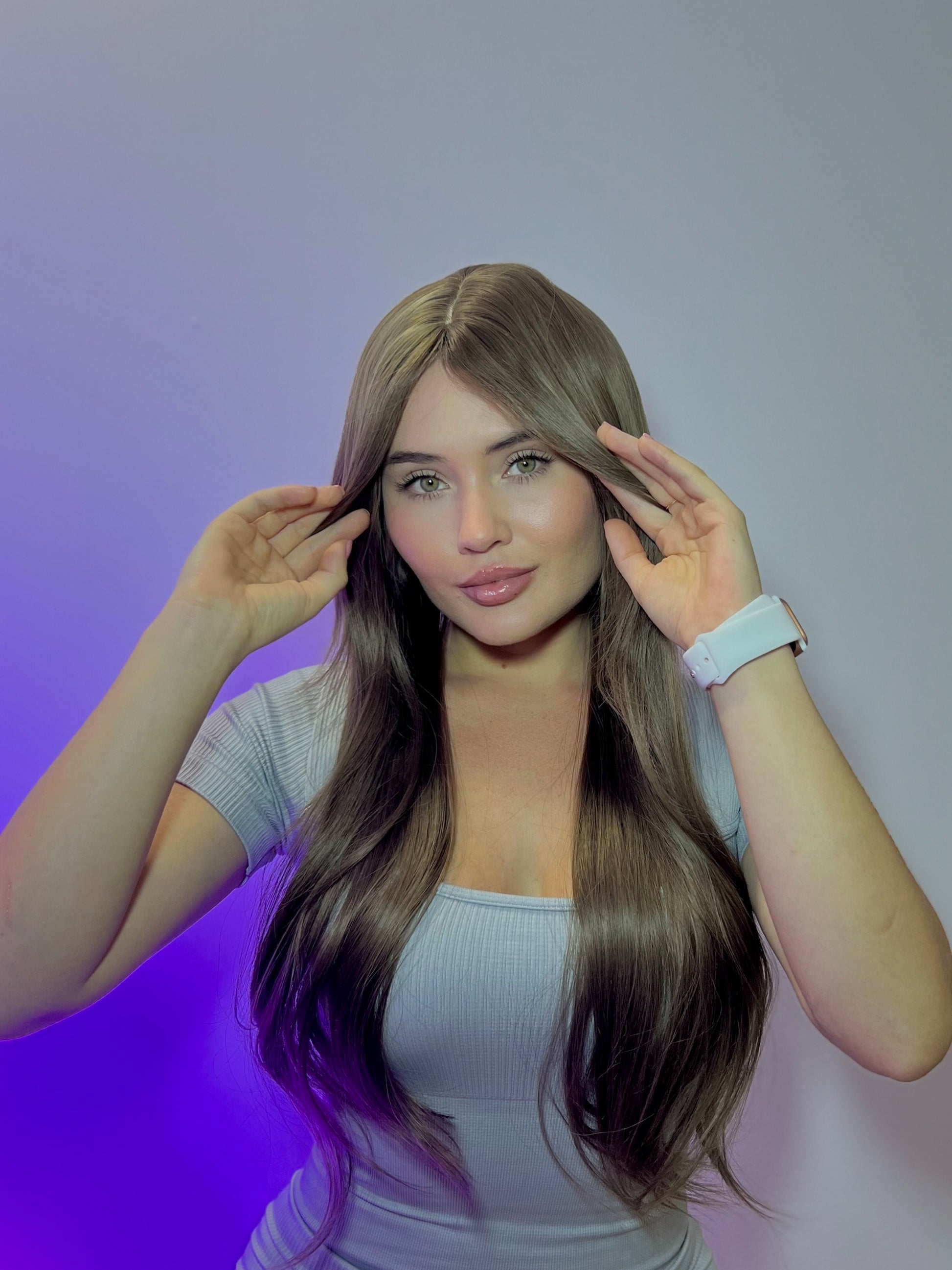 La Aurora de Miel es una peluca larga, lacia y en tono castaño claro, que evoca la suavidad de los rayos dorados iluminando la noche bajo la luna 🌕✨.