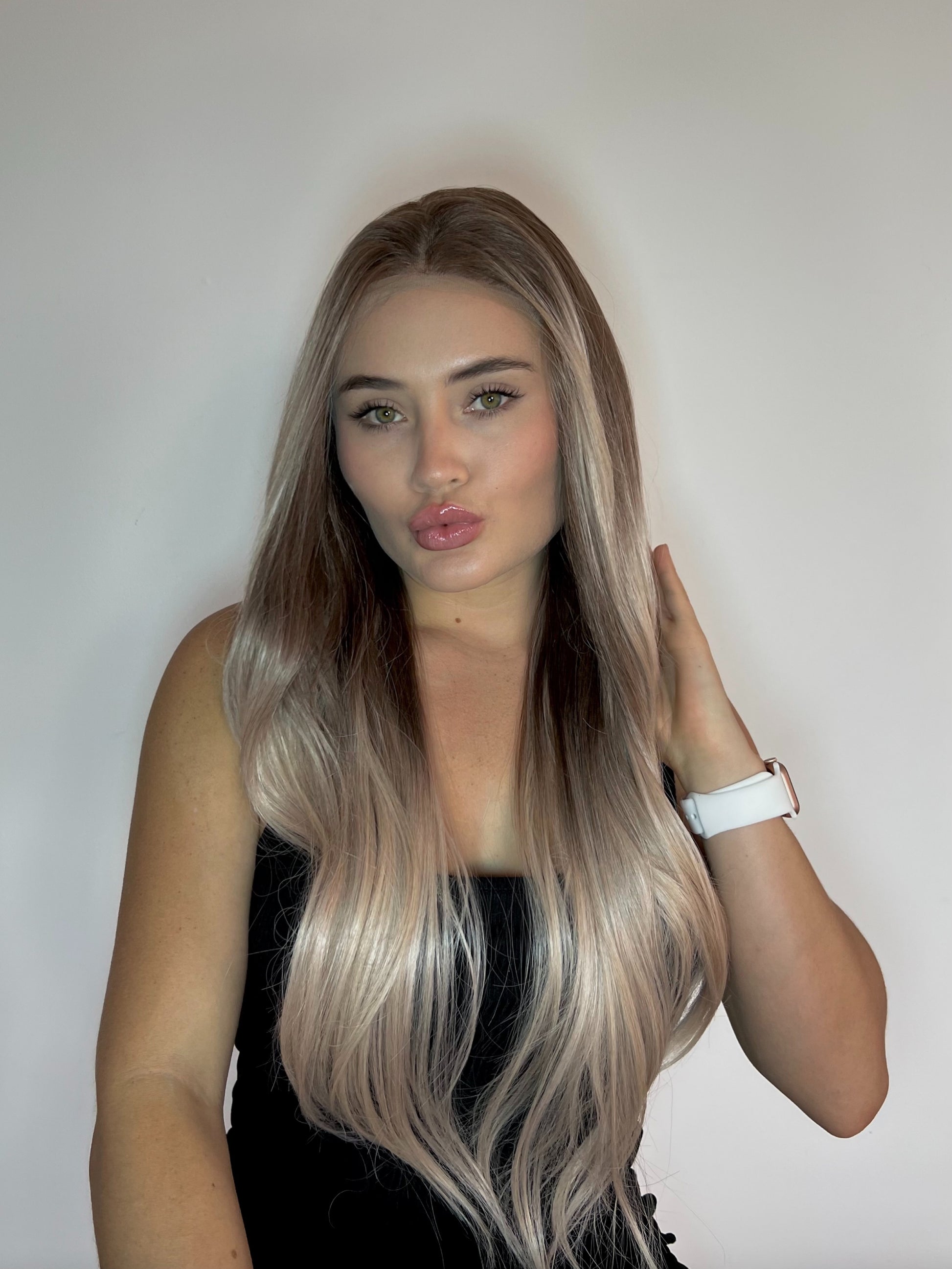 La Aurora Dorada es una peluca de lace rubia con raíz castaño claro, extra larga y ondulada, diseñada para quienes quieren reflejar la elegancia de la luna cuando despierta el amanecer ☀️🌙.