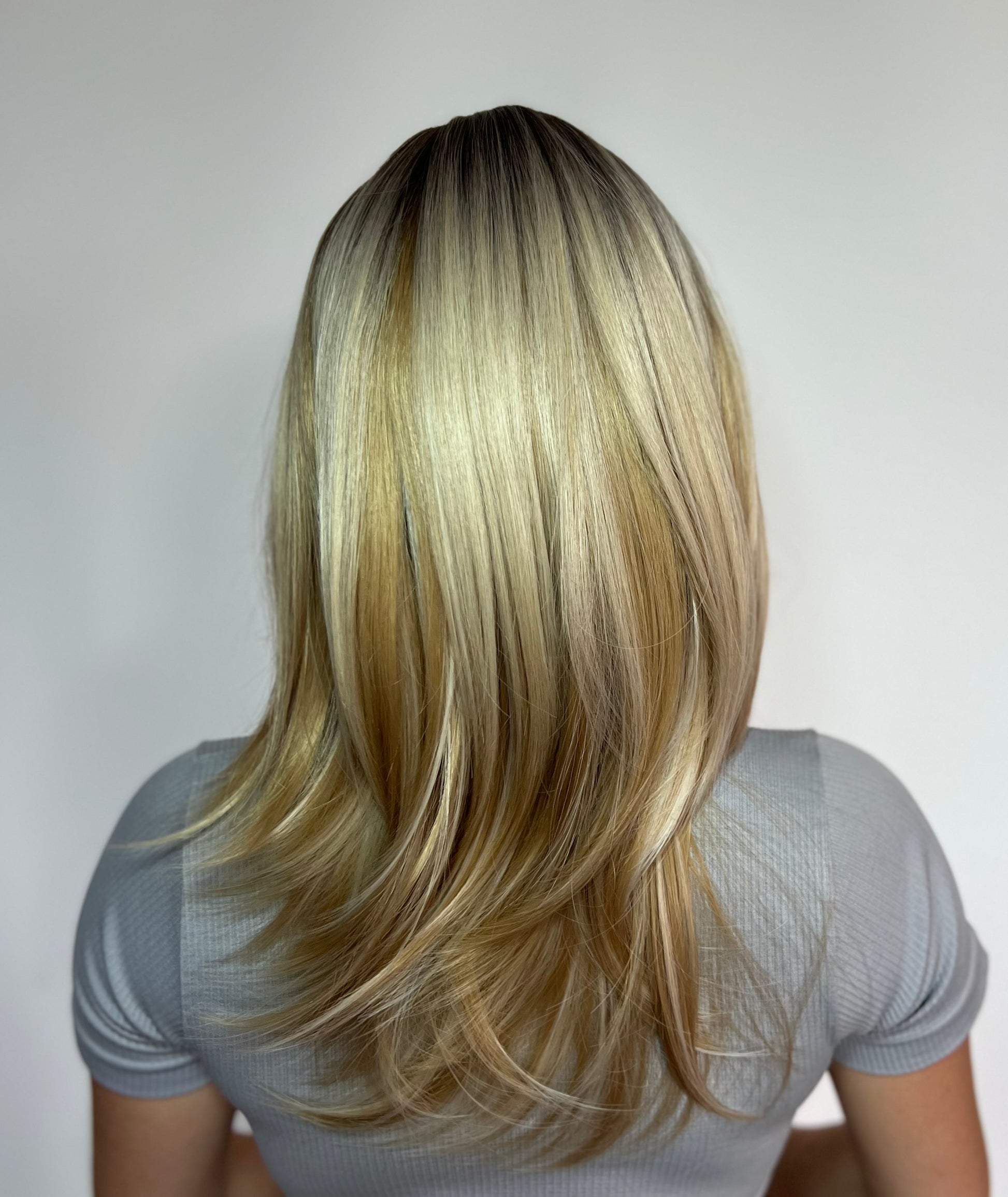 Su tono rubio con raíces oscuras le da un contraste natural y sofisticado, como la luz lunar emergiendo del cielo nocturno. 🌌💫