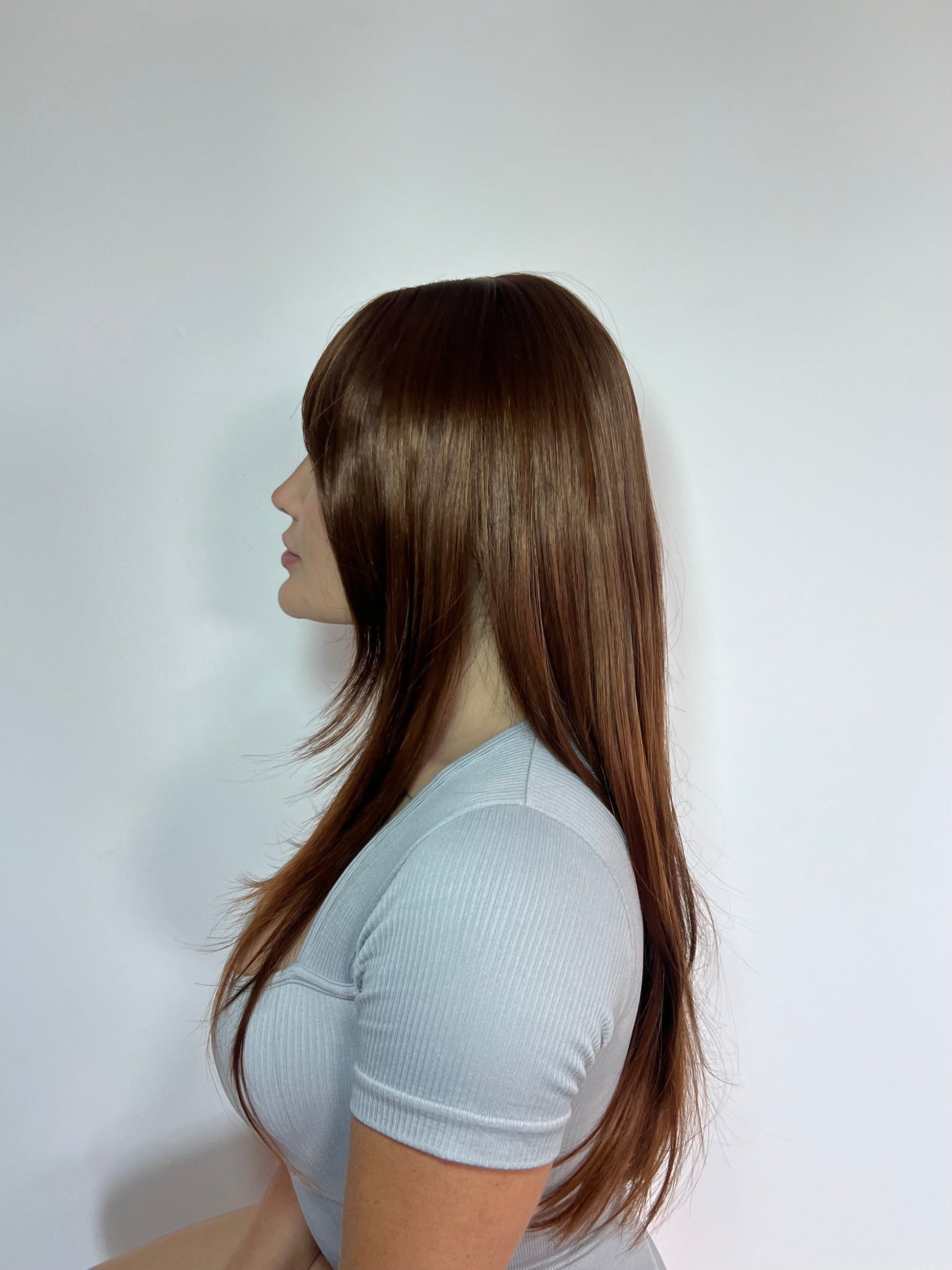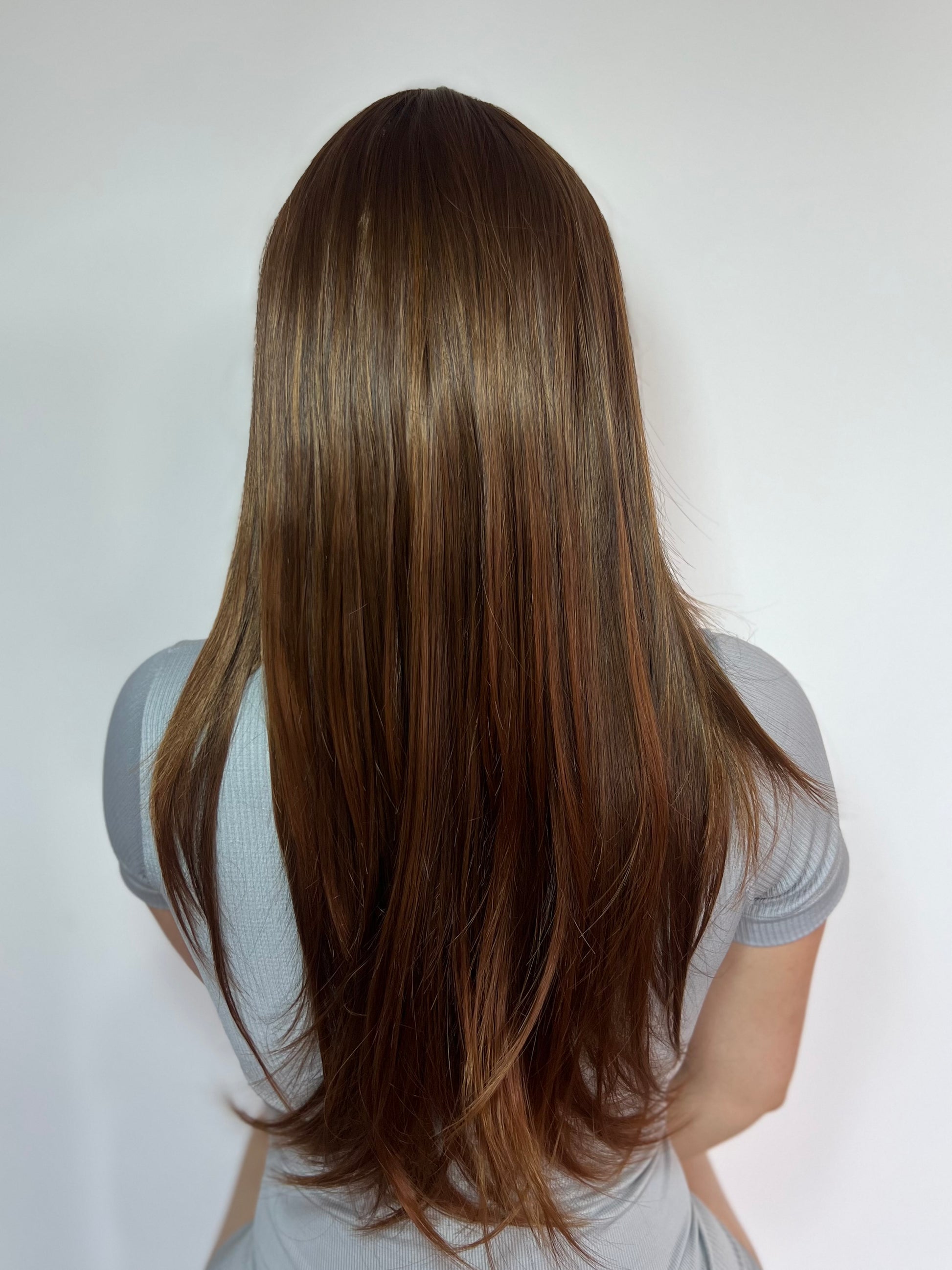 “Eclipse de Fuego” combina la intensidad del castaño profundo con un destello cobrizo brillante en las puntas, evocando la magia de un eclipse lunar en pleno resplandor. Su caída lacia y fluida transmite elegancia, fuerza y un aire místico que te hará destacar en cualquier ocasión.