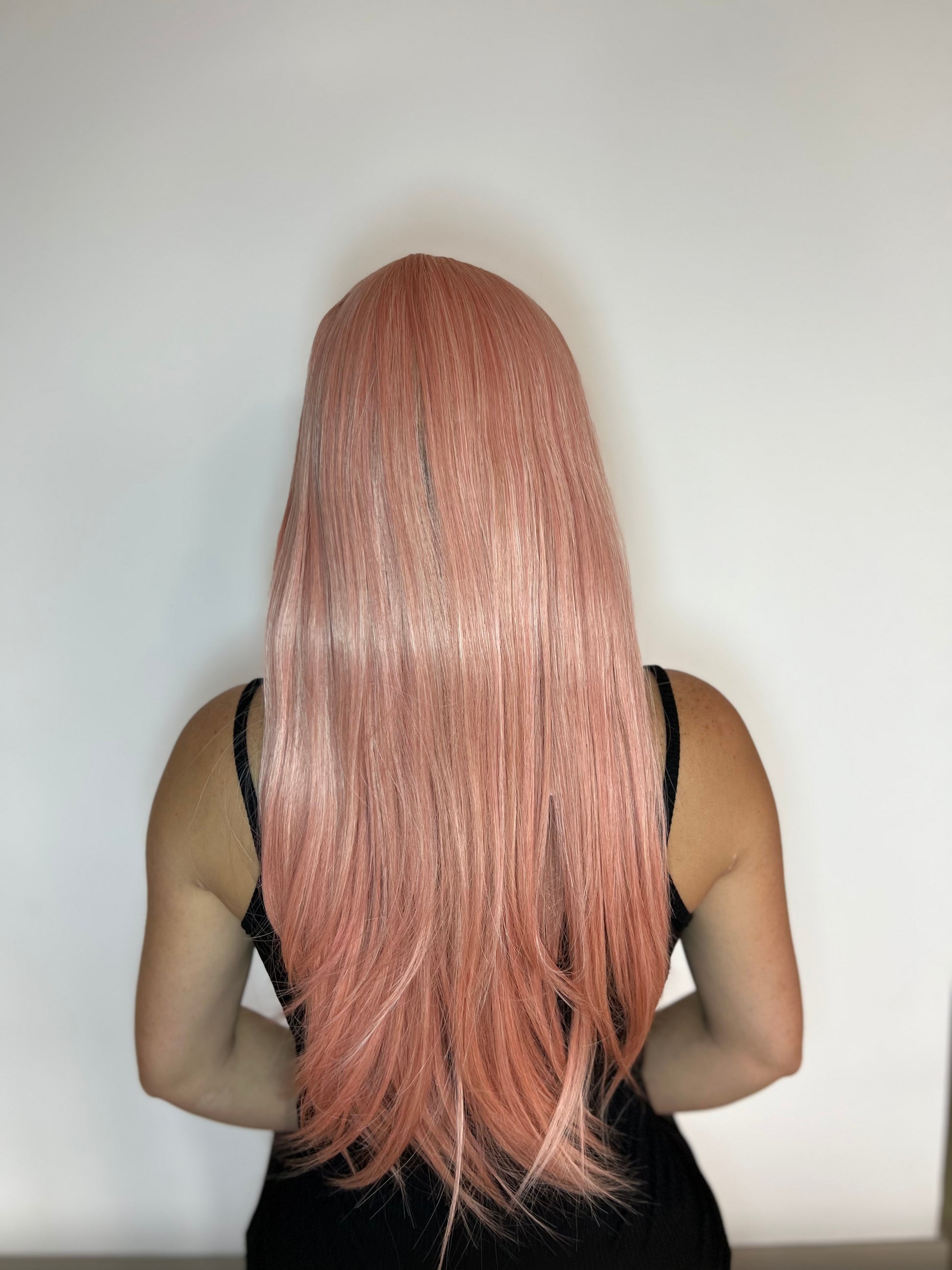 Esta peluca en tono rosado claro transmite ternura, delicadeza y un aire místico que ilumina tu presencia.
