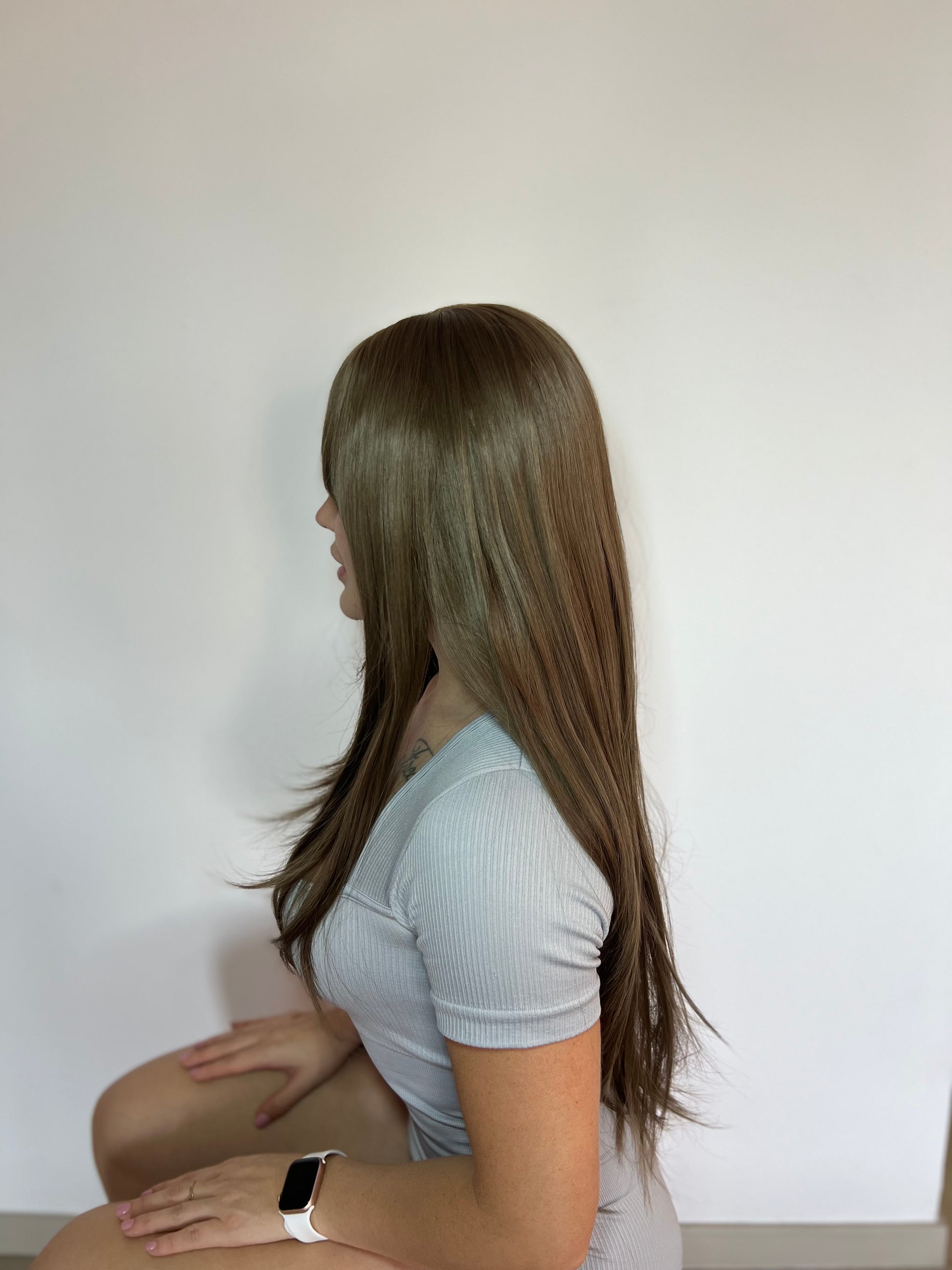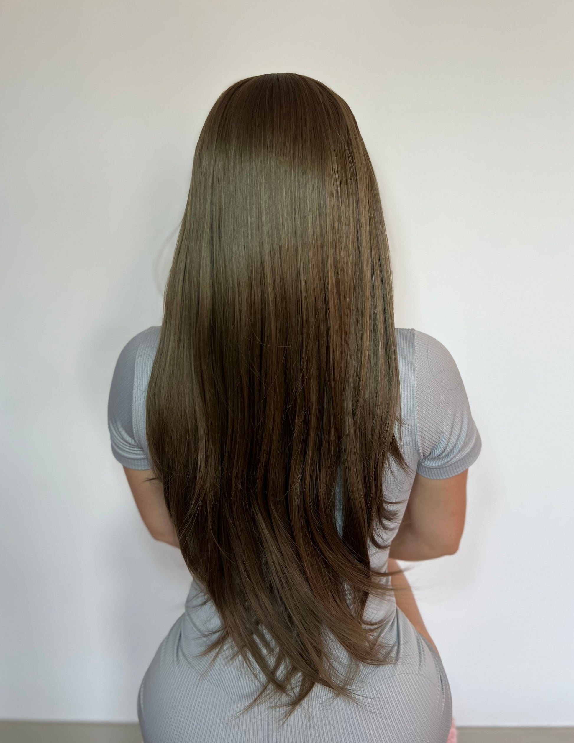 La peluca castaño larga con corte en puntas es la esencia de la elegancia natural 🌙✨. Su tonalidad cálida recuerda la luz suave de la aurora que anuncia un nuevo día, envolviendo tu rostro en un halo de sofisticación y frescura.